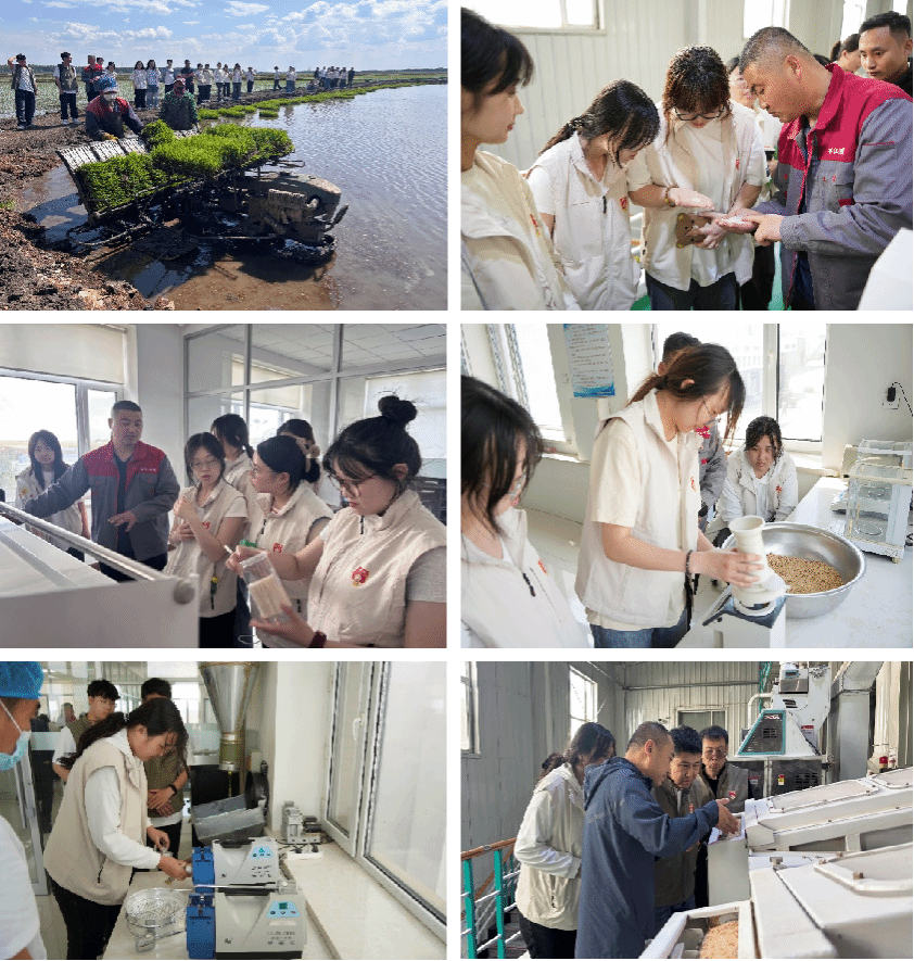 实践第二站来到校企合作基地吉林省松江佰顺米业有限公司,进行“青秧植沃土 校企育英才”。主题实践活动。公司执行总经理赵英灼、运营副总经理方禾亮、生产总经理李少东、销售副总经理钟启梁等高管团队全程陪同研学。在万亩标准化种植基地,学员实地考察机械化插秧作业,对比传统农耕与现代农机效率差异。加工车间内,从稻谷清理、色选分级到碾米抛光等20余道工序的全自动生产线,完整呈现"一粒米"的科技蜕变。企业特别设置质检实操环节,学员在技术员指导下完成食味值检测、水分测定等专项实验,深化课堂理论应用。